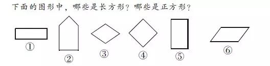 在认识了长方形和正方形的特征之后,我出示了下面的问题:下面的图形中,哪些是长方形?哪些是正方形?